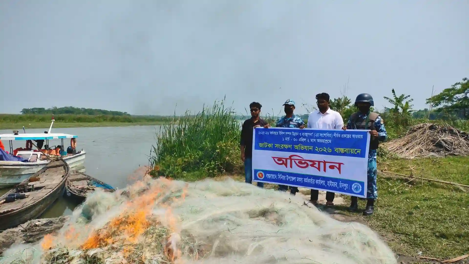 বৃহস্পতিবার (২ এপ্রিল) ভোরে পরিচালিত এই অভিযানে বিপুল পরিমাণ অবৈধ জাল, নৌকা এবং মাছ জব্দ করা হয়। সেই সঙ্গে একটি অবৈধ মাছের আড়ত উচ্ছেদ করেছে প্রশাসন।