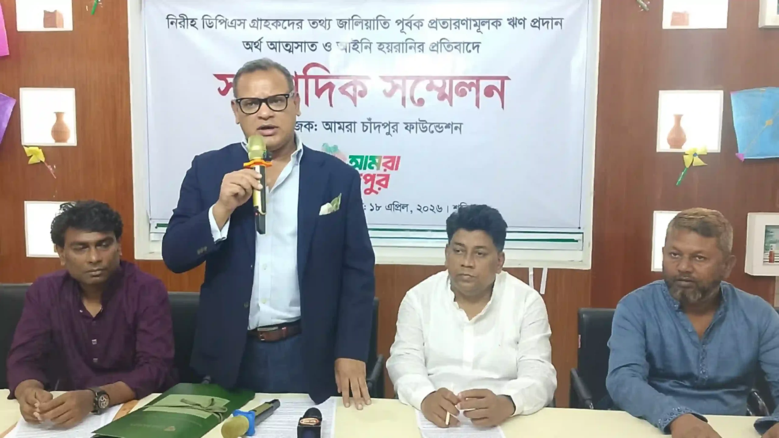 ​শনিবার (১৮ এপ্রিল) দুপুরে চাঁদপুর প্রেসক্লাবে আয়োজিত এক সংবাদ সম্মেলনে সংগঠনের পক্ষে মূল বক্তব্য উপস্থাপন করেন বাংলাদেশ সুপ্রিম কোর্টের আইনজীবী ব্যারিস্টার হামিদুল মিসবাহ। সংবাদ সম্মেলনে ভুক্তভোগীরা জানান, তারা ব্যাংকে ডিপিএস করতে গিয়ে এখন জালিয়াতির মামলায় সাজাপ্রাপ্ত হয়ে জেল খাটছেন।