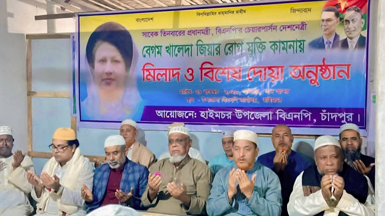 সাবেক প্রধানমন্ত্রী বিএনপি চেয়ারপারসন বেগম খালেদা জিয়ার রোগমুক্তি কামনায় চাঁদপুরের হাইমচর উপজেলা বিএনপি ও অঙ্গ সহযোগী সংগঠনের আয়োজনে মিলাদ মাহফিল ও দোয়ার আয়োজন করা হয়েছে।